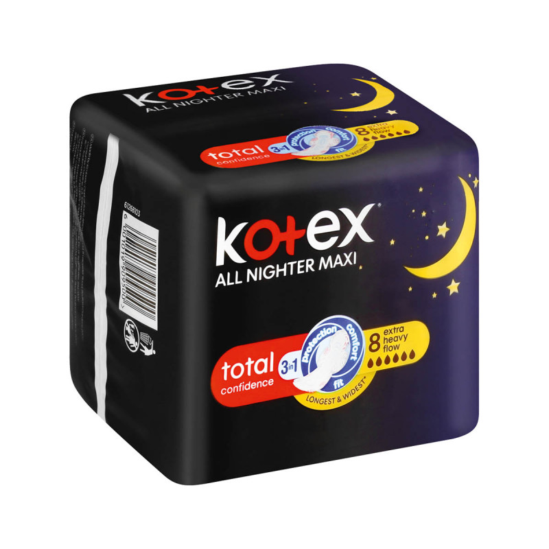 Kotex All Nighter Maxi Pads are the brand's longest and widest pads for maximum protection against an extra heavy flow – day or night. The all-nighter pads have a 3-in-1 system designed for maximum skin comfort and is thicker to offer extra protection against leakage and added peace of mind